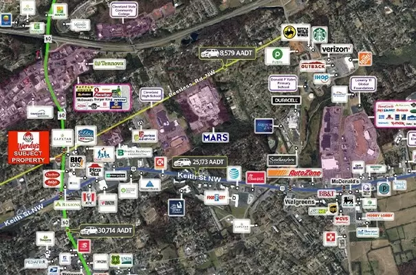 Wendy’s is strategically located along 25th Street NW in Cleveland, Tennessee, with access to a daily traffic count of approximately 28,800 vehicles. The site is surrounded by major national retailers including Big Lots, KFC, Papa John’s, Arby’s, Tractor Supply, and Taco Bell, driving consistent consumer traffic to the area. The property is located near several schools, established residential communities, and major employment centers such as the Mars Chocolate North America Factory and the Life Care Centers of America Headquarters. The five-mile trade area is home to approximately 75,414 residents with an average household income of $78,388. Located approximately 30 miles northeast of Chattanooga, the site also offers convenient access to surrounding regional destinations such as Athens (27.5 miles Northeast) and Dalton (8.1 miles South).