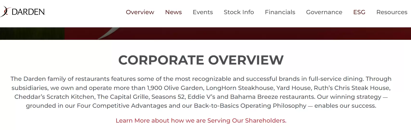 Darden Restaurants, Inc. (NYSE: DRI) is an American multi-brand restaurant operator. In 1995, General Mills decided to spin off its restaurant chains to focus on consumer food products; the new company was named Darden Restaurants, Inc.. Over the years, they have grown into 6 casual dining restaurant chains (Olive Garden Italian Restaurant, LongHorn Steakhouse, Bahama Breeze, Seasons 52, Yard House and Cheddar's Scratch Kitchen) and 2 fine dining restaurant chains (Eddie V's and The Capital Grille). Darden Restaurants now owns and operates more than 1,850 restaurant locations and employs over 180,000 people, making it the largest full-service restaurant company in America. The company has an investment grade credit rating of BBB from Standard & Poor’s and a long-term rating of Baa2 from Moody’s. In 2022, the company had a market cap of $16.92B and a revenue of $9.98B. Their 2022 net earnings were $955M. Darden Restaurants, Inc. is headquartered in Orlando, FL.
