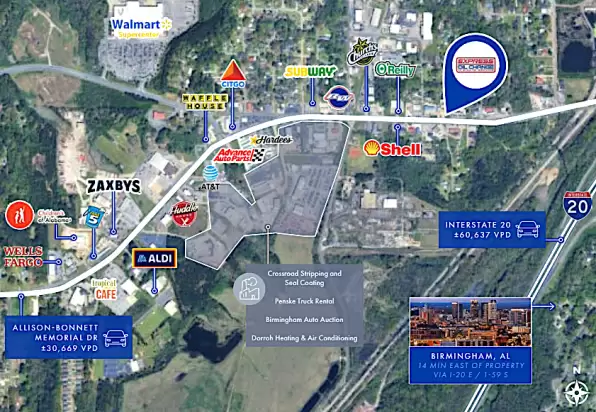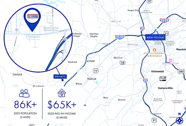 Express Oil Change is strategically located on Allison-Bonnett Memorial Drive in Dolomite, Alabama. The property benefits from excellent visibility and convenient access along Allison-Bonnett Memorial Drive (AL-150), a major arterial roadway connecting Dolomite to Bessemer, Hoover, and the greater Birmingham metropolitan area. The site is positioned within a well-established retail corridor and is surrounded by major national and regional retailers, including Walmart Supercenter, Lowe’s, Publix, Home Depot, McDonald’s, and Taco Bell. The property is located within the Jefferson County School District, which includes McAdory Elementary School, McAdory Middle School, and McAdory High School. Dolomite is a well-established community in Jefferson County, located approximately 8 miles southwest of downtown Birmingham within the Birmingham–Hoover metropolitan area.