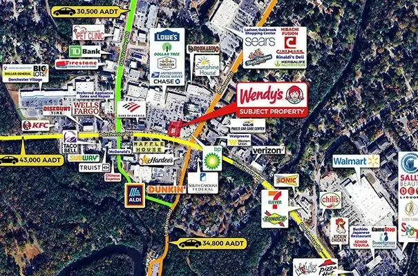 Wendy’s is strategically located along Dorchester Road in Summerville, South Carolina, with access to a daily traffic count of approximately 69,812 vehicles. The site is surrounded by major national retailers including Walmart and Lowe’s Foods, as well as numerous quick-service restaurants and neighborhood shopping destinations, driving consistent consumer traffic to the area. The property is located near several schools, residential communities, and new developments such as Trident Technical College, Charleston Southern University, Limehouse Village, Crescent Cove, and Summerville Station. The five-mile trade area is home to approximately 121,373 residents with an average household income of $93,286. Located approximately 22 miles northwest of Charleston, the site also offers convenient access to surrounding regional destinations such as North Charleston (12 miles Southeast) and Goose Creek (8.9 miles Northeast).