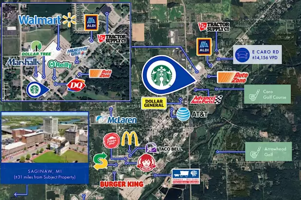 Starbucks is strategically located on E. Caro Road in a brand-new, 2,511-square-foot freestanding building on a 1.10-acre parcel, featuring ample parking and a modern drive-thru. The site functions as an outparcel to a 175,000-square-foot Walmart Supercenter, the primary grocery and retail destination in Caro. The property benefits from excellent visibility and access along E. Caro Road, which carries 14,156 vehicles per day, and is surrounded by a strong mix of national retailers, including Walmart Supercenter, Marshalls, Tractor Supply, Aldi, Dollar Tree, O’Reilly Auto Parts, AutoZone, Advance Auto Parts, McDonald’s, Wendy’s, Taco Bell, Burger King, and Pizza Hut. The property is located within the Caro Community Schools district, a public school system serving grades Pre-K through 12, with campuses including McComb Elementary School, Schall Elementary School, Caro Middle School, Caro High School, and Caro Alternative High School. Caro, the county seat of Tuscola County, lies in Michigan’s “Thumb” region, approximately 33 miles east of Saginaw, ±49 miles northeast of Flint, and about 92 miles north of Detroit.
