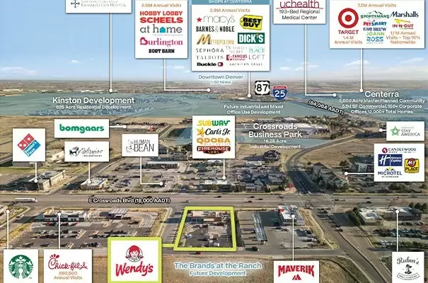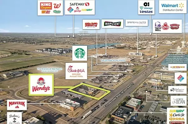 Wendy’s is strategically located along E Crossroads Boulevard in Loveland, Colorado, with access to a daily traffic count of approximately 18,800 vehicles on E Crossroads Blvd and 84,064 vehicles on Interstate 25. The site is surrounded by major national retailers including Maverik, Chick-fil-A, Starbucks,etc., driving consistent consumer traffic to the area. The property is located near several schools, residential communities, and new developments such as Mountain View High School, Windsor High School, the Centerra master-planned community (3,000 acres), and the Kinston residential development. The five-mile trade area is home to approximately 78,202 residents with an average household income of $148,820. Located approximately 45 miles from Downtown Denver, the site also offers convenient access to surrounding regional destinations such as Fort Collins(15.4 miles northwest) and Windsor(8.3 miles northeast).