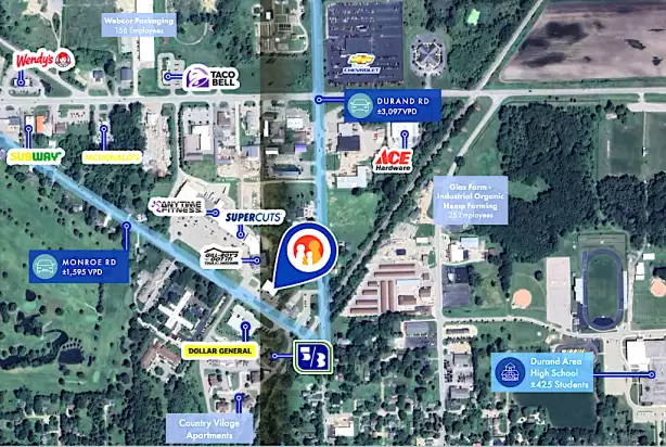 Family Dollar is strategically located along Monroe Road (M‑71) in a freestanding retail building on a 1.03‑acre parcel, featuring ample parking and excellent visibility. The site is positioned within Durand’s primary retail corridor and is surrounded by major national retailers, including Dollar General, Family Dollar, AutoZone, O’Reilly Auto Parts, McDonald’s, Subway, and Speedway, serving as the primary shopping and service destination for the local and regional population. The property benefits from direct access to Monroe Road, a key thoroughfare connecting Durand to Interstate 69, providing convenient regional connectivity to larger markets such as Flint and Lansing. The property is located within the Durand Area Schools district, a public school system serving grades Pre-K through 12, including Durand High School, Durand Middle School, and several elementary campuses. Durand, a central community in Shiawassee County, lies approximately 23 miles northwest of Flint, 35 miles southeast of Lansing, and 80 miles north of Detroit.