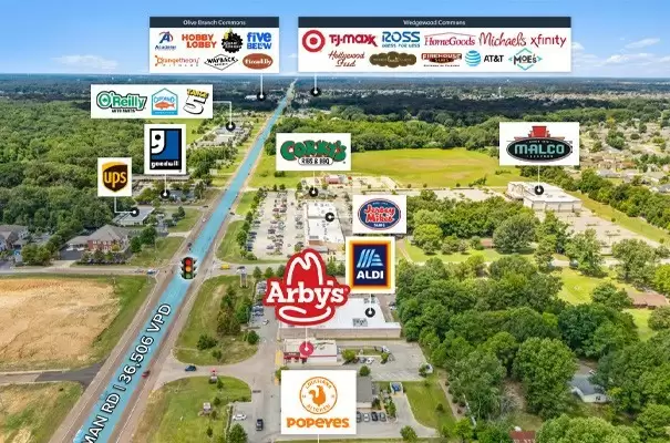 Arby’s is strategically located along Goodman Rd (U.S. Highway 78) in Olive Branch, Mississippi, with access to a daily traffic count of approximately 36,506 vehicles. The site is surrounded by major national retailers including Walmart Supercenter, Kroger, Lowe’s, AutoZone, Walgreens, McDonald’s, and Dairy Queen, driving consistent consumer traffic to the area. The property is located near...
