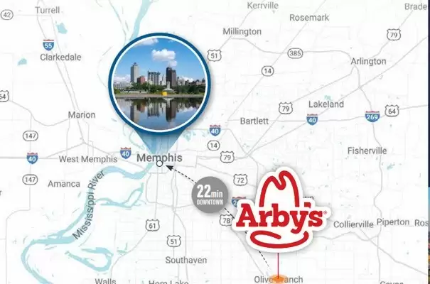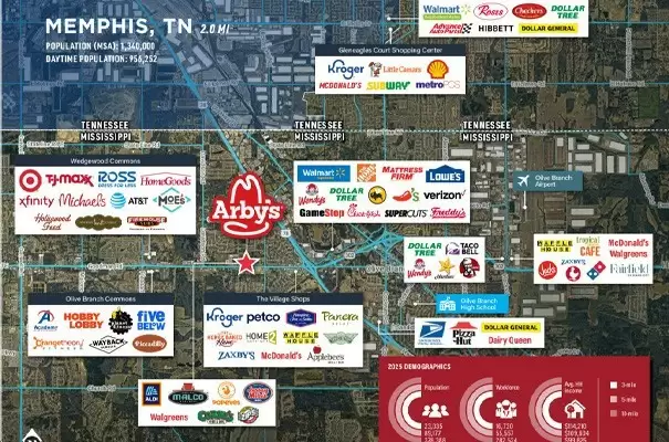 Arby’s is strategically located along Goodman Rd (U.S. Highway 78) in Olive Branch, Mississippi, with access to a daily traffic count of approximately 36,506 vehicles. The site is surrounded by major national retailers including Walmart Supercenter, Kroger, Lowe’s, AutoZone, Walgreens, McDonald’s, and Dairy Queen, driving consistent consumer traffic to the area. The property is located near several schools, residential communities, and new developments such as Olive Branch High School, Wedgewood Commons, Olive Branch Commons, and The Village Shops. The five-mile trade area is home to 55,557 residents with an average household income of $109,604. Located approximately 22 miles from Downtown Memphis, the site also offers convenient access to surrounding regional destinations such as Southaven, MS (9.2 miles northwest) and Germantown, TN (12 miles north).