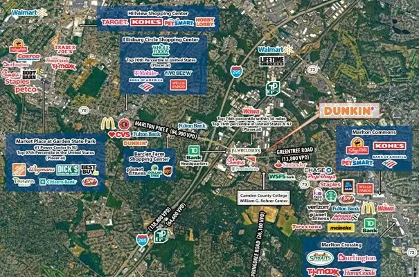 Dunkin’ is strategically located along Marlton Pike East in Cherry Hill, New Jersey, with access to a daily traffic count of approximately 98,700 vehicles. The site is surrounded by major national retailers including Whole Foods Market, ShopRite, Aldi, CVS Pharmacy, Kohl’s, Five Below, PetSmart, Staples, Planet Fitness, Advance Auto Parts, Firestone, Verizon, T-Mobile, Chipotle, McDonald’s, Chick-fil-A, Taco Bell, Dunkin’, Starbucks, and Raising Cane’s, driving consistent consumer traffic to the area. The property is located near established residential communities and benefits from commercial growth in Camden County, supported by major employers such as Campbell’s Soup Company, Subaru, American Water, TD Bank, and J&J Snack Foods. The five-mile trade area is home to approximately 235,314 residents with an average household income of $155,806. Located approximately 9 miles from Philadelphia, the site also offers convenient access to surrounding regional destinations such as Atlantic City(62.2 miles southeast) and New York City(85.1 miles north east).