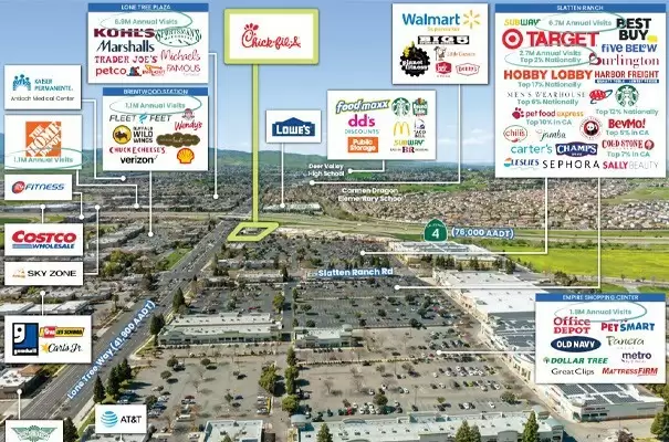 The Chick-fil-A – Antioch, CA (Slatten Ranch Shopping Center) is strategically located along Lone Tree Way in Antioch, California, with access to a daily traffic count of approximately 117,900 vehicles. The site is surrounded by major national retailers including Target, Hobby Lobby, Sephora, etc, driving consistent consumer traffic to the area. The property is located near several schools, residential communities, and new developments such as Deer Valley High School, Freedom High School, Carmen Dragon Elementary School, Isaac R. Montañez Elementary School, Diamond Hills Sports Club & Spa, and the proposed Slatten Ranch Townhomes. The five-mile trade area is home to approximately 311,251 residents with an average household income of $145,206. Located approximately 45 miles from San Francisco and 40 miles from Oakland, the site also offers convenient access to surrounding regional destinations such as Brentwood(6 miles southeast) and Stockton(32 miles east).