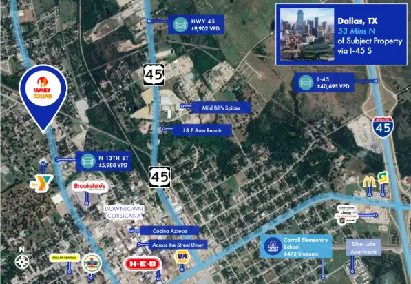 The property at 924 N 13th St in Corsicana, Texas is located in a north Corsicana neighborhood that blends residential uses with small-format retail and services. The site is within a short drive of major retailers including Walmart Supercenter, Brookshire’s, Super 1 Foods, Dollar General, CVS, Atwoods Ranch & Home, Harbor Freight Tools, College Park Mall, and several local restaurants and convenience stores. The location benefits from strong roadway access, with Interstate 45 just minutes away, providing direct north–south connectivity between Dallas–Fort Worth and Houston, along with access to U.S. Highway 287 and State Highway 22 for regional travel. Corsicana has a population of approximately 25,000 residents, and the surrounding 5-mile trade area reflects an average household income of roughly $81,756 with a 5-mile population of 28,645. Geographically, Corsicana sits about 55 miles south of Dallas (approximately a one-hour drive), 184 miles north of Houston (about 2 hours and 40 minutes), and 158 miles northeast of Austin (roughly 2.5 hours), positioning the site within a well-connected Central–North Texas corridor.