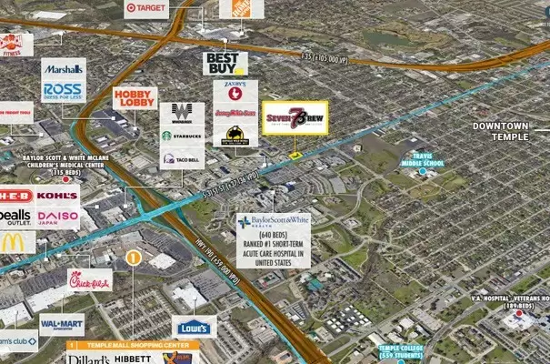 7 Brew Coffee is strategically located along South 31st Street in Temple, Texas, with access to a daily traffic count of approximately 37,136 vehicles. The site is surrounded by major national retailers including Walmart, Target, H-E-B, Home Depot, Lowe’s, Starbucks, Chick-fil-A, McDonald’s, and Whataburger, driving consistent consumer traffic to the area. The property is located near several schools, residential communities, and new developments such as Temple College, Baylor Scott & White Medical Center, and surrounding residential growth corridors. The five-mile trade area is home to approximately 88,159 residents with an average household income of $84,235. Located approximately 65 miles from Austin, the site also offers convenient access to surrounding regional destinations such as Waco(38.2 miles northeast) and Killeen(27.8 miles west).