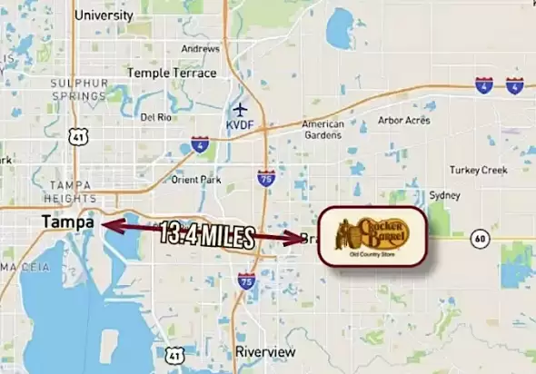 Cracker Barrel is strategically located along State Road 60 in Valrico, Florida, with access to a daily traffic count of approximately 65,000 vehicles. The site is surrounded by major national retailers including Walmart, Lowe’s, Publix, Target, Home Depot, Chick-fil-A, Starbucks, and numerous regional restaurants and shopping centers, driving consistent consumer traffic to the area. The property is located near several schools, residential communities, and new developments such as the Brandon Town Center retail corridor and expanding residential neighborhoods in Valrico and Brandon. The five-mile trade area is home to 194,143 residents with an average household income of $109,001. Located approximately 14 miles east of Downtown Tampa, the site also offers convenient access to surrounding regional destinations such as Plant City (16 miles north east).