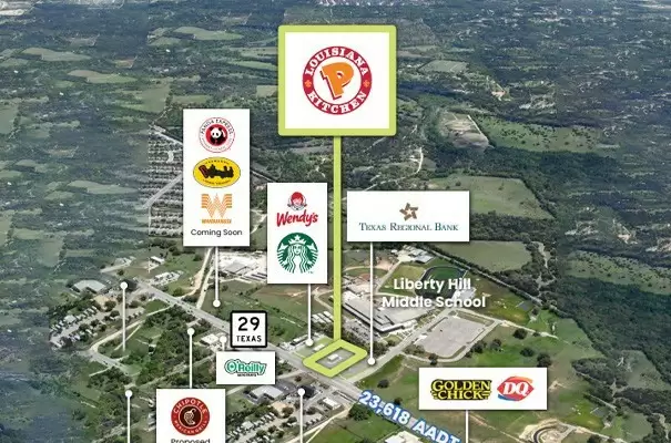 Popeyes – Liberty Hill is strategically located along TX-29 in Liberty Hill, Texas, with access to a daily traffic count of approximately 23,618 vehicles. The site is surrounded by major national retailers including HEB, McDonald’s, Starbucks, Whataburger, CVS, Walgreens, and a Home Depot under construction, driving consistent consumer traffic to the area. The property is located near several schools, residential communities, and new developments such as Liberty Hill Independent School District campuses, new master-planned residential neighborhoods, and commercial projects along the TX-29 corridor. The five-mile trade area is home to 46,432 residents with an average household income of $137,941. Located approximately 33 miles from Austin, the site also offers convenient access to surrounding regional destinations such as Georgetown(12.1 miles northeast) and Cedar Park(5.4 miles south).