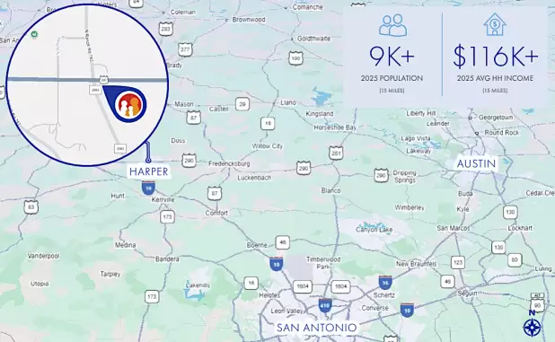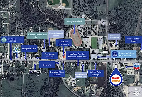 Family Dollar is strategically located on US-290, offering excellent visibility and direct access along a major regional thoroughfare connecting the Texas Hill Country to Fredericksburg and Kerrville. The property benefits from prominent frontage on US-290, capturing both local traffic and pass-through travelers. The site is positioned within a limited retail base, allowing Family Dollar to serve as a primary daily-needs shopping destination for the surrounding community. The property is located within the Harper Independent School District, which serves Harper Elementary School, Harper Middle School, and Harper High School, supporting a stable local customer base. The five-mile trade area has a population of 1,558 residents with an average household income of $115,240. The location provides convenient access to key regional markets, including Fredericksburg (approximately 15 miles east), Kerrville (20 miles west), and Austin (approximately 85 miles east).