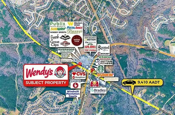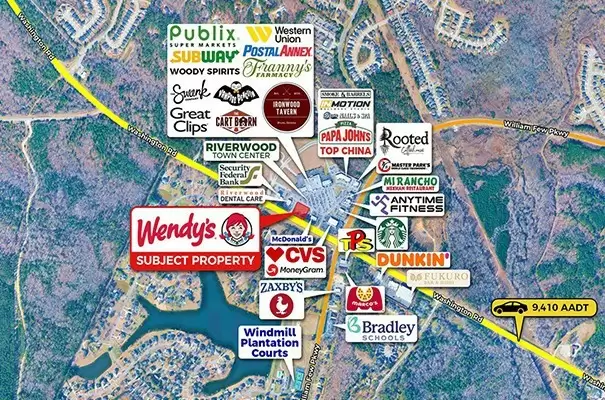 Wendy’s is strategically located along Washington Road in Evans, Georgia, within the Augusta Metropolitan Statistical Area, a vibrant and growing suburb with strong commercial activity. The property benefits from placement on a major thoroughfare with strong daily traffic due to its positioning as a Publix-anchored shopping center outparcel. The site is surrounded by major national retailers including Publix, Wendy’s, and nearby quick-service and retail tenants that contribute to strong cross-shopping and consumer traffic throughout the day. The property is located near several schools, residential communities, and new developments such as Augusta University, Georgia Military College, Helms College, etc., providing a stable population base and consistent customer demand.The five-mile trade area is home to approximately 55,277 residents with an average household income of $153,774, reflecting strong local demographics and purchasing power. Located approximately 10 miles from downtown Augusta, the site also offers convenient access to surrounding regional destinations such as Martinez (9.3 miles Southeast) and Grovetown (11.4 miles South), further enhancing its strategic position within the growing Augusta metro corridor.